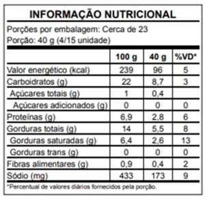 Creme de ricota (ricota fresca (soro de leite, leite pasteurizado, acidulante ácido lático e conservador sorbato de potássio), creme de leite, massa coalhada (leite pasteurizado e fermento lácteo), cloreto de sódio e acidulante ácido cítrico e estabilizantes goma guar e goma xantana), farinha de trigo enriquecida com ferro e ácido fólico, espinafre, água, margarina (gordura composta (óleo de soja*, óleo de palma, estearina de palma, e óleo de soja* interesterificado), água, 15.000U.L de vitamina A por Kg, emulsificantes INS471 e INS322, conservadores INS211 e INS202, aroma idêntico ao natural de manteiga, antioxidante INS321, acidulante INS330 e corantes INS160b e INS100i, (*geneticamente modificados a partir do Agrobacterium tumefaciens e/ou Bacilus thuringiensis e/ou Delftia acidovoran e/ou Stenotrophomonas maltophialia e/ou Streptomyces viridochromogenes e/ou Zea mays), cebola, amido de mandioca modificado, ovo, alho, sal refinado, realçador de sabor glutamato monossódico, açúcar e emulsificante INS433.
